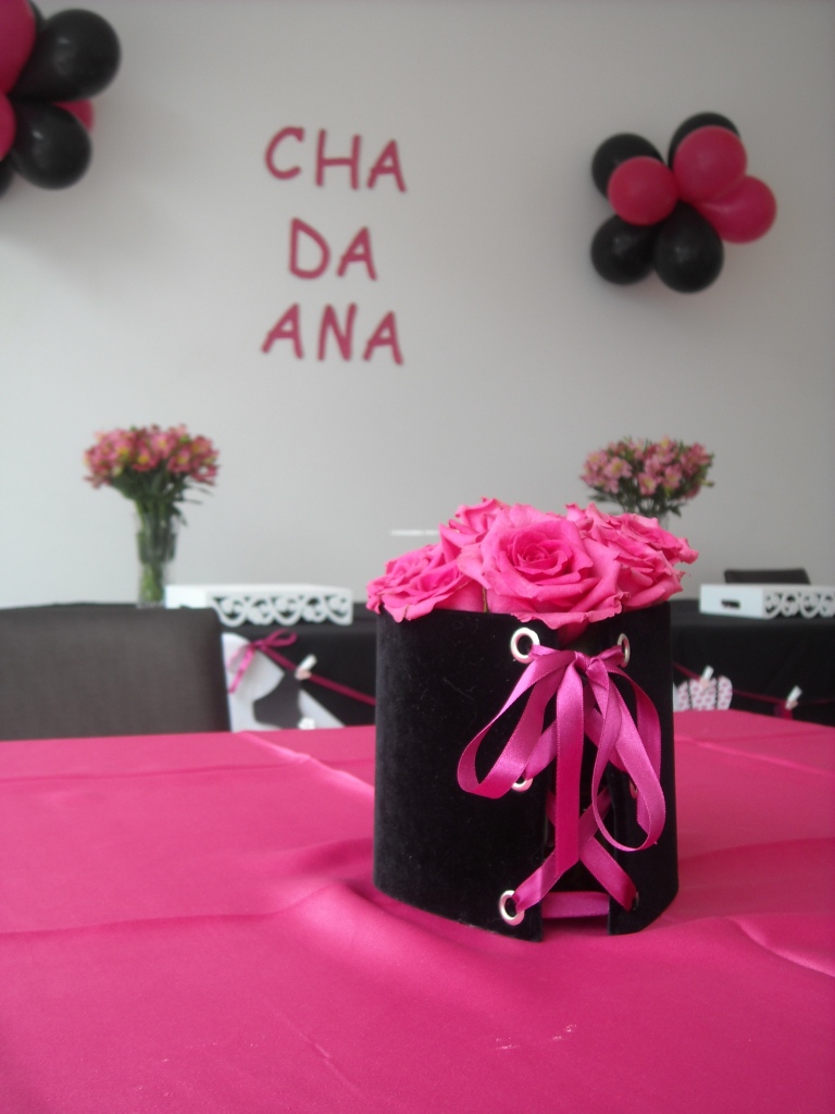 A querida Ana Paula me pediu que decorasse o chá de lingerie dela, todo em rosa pink e preto! Cupcakes para lembrancinhas, varalzinho de lingerie, bloquinho para as amigas deixarem recados, tags para os doces, arranjos de mesa, letreiros de parede e decoração com balões! Ficou um luxo!